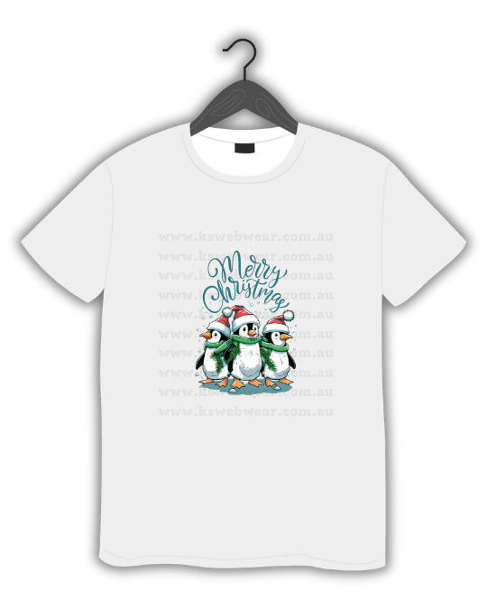Celebrate the holidays in style with our Merry Christmas Penguins T-Shirt! This charming design features three adorable penguins dressed in festive Santa hats, spreading holiday cheer. Perfect for Christmas parties, cozy family gatherings, or as a delightful gift, this tee captures the essence of the holiday season. Made with premium, soft fabric, it ensures comfort and durability for all your festive activities. Bring a touch of cuteness and joy to your wardrobe with this penguin-themed Christmas t-shirt!